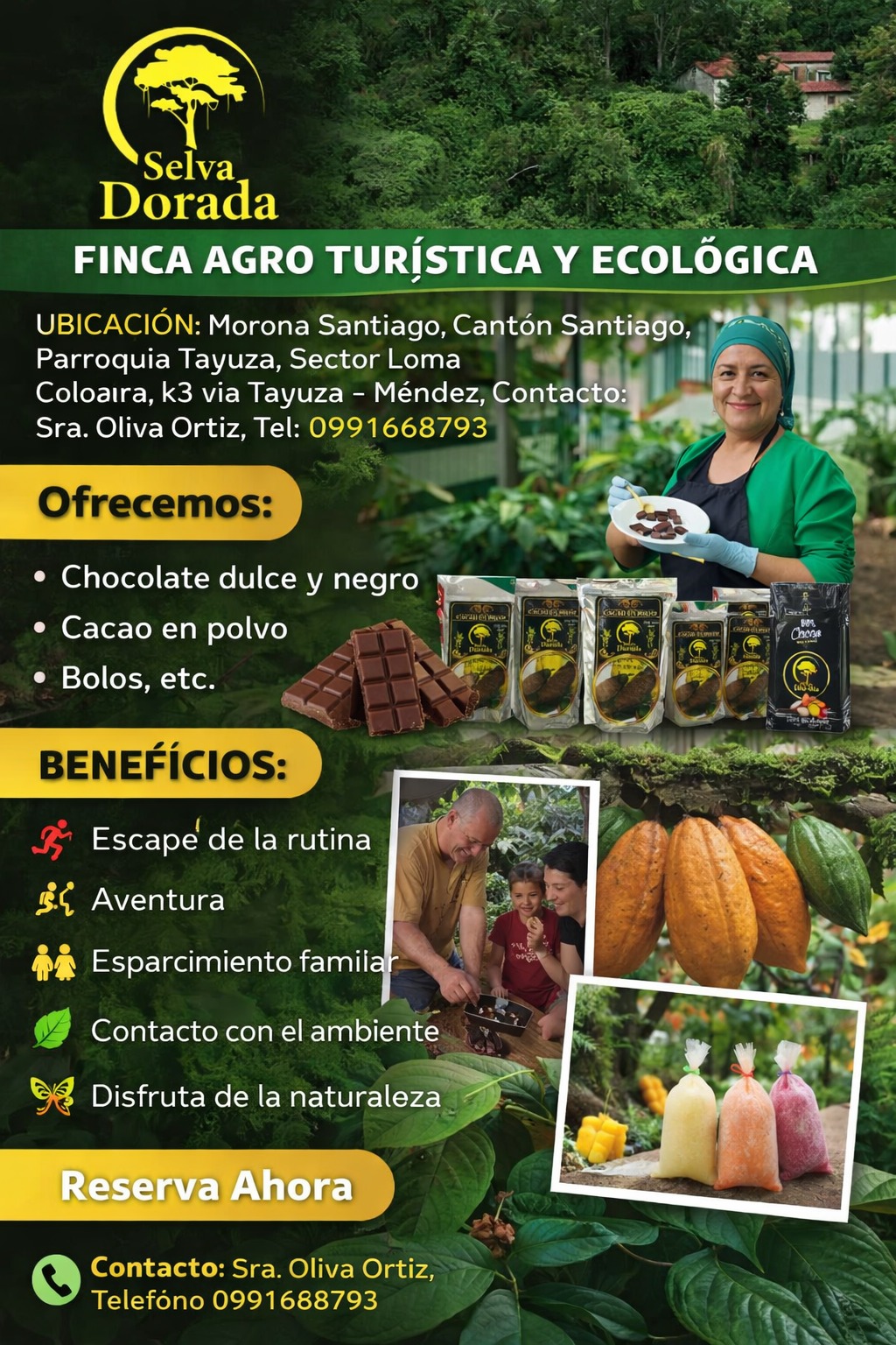 Ofrecemos servicio de restaurante con platos preparados con ingredientes frescos de la región. Podrás disfrutar de la gastronomía local y de opciones tradicionales ecuatorianas en un ambiente natural y relajante.